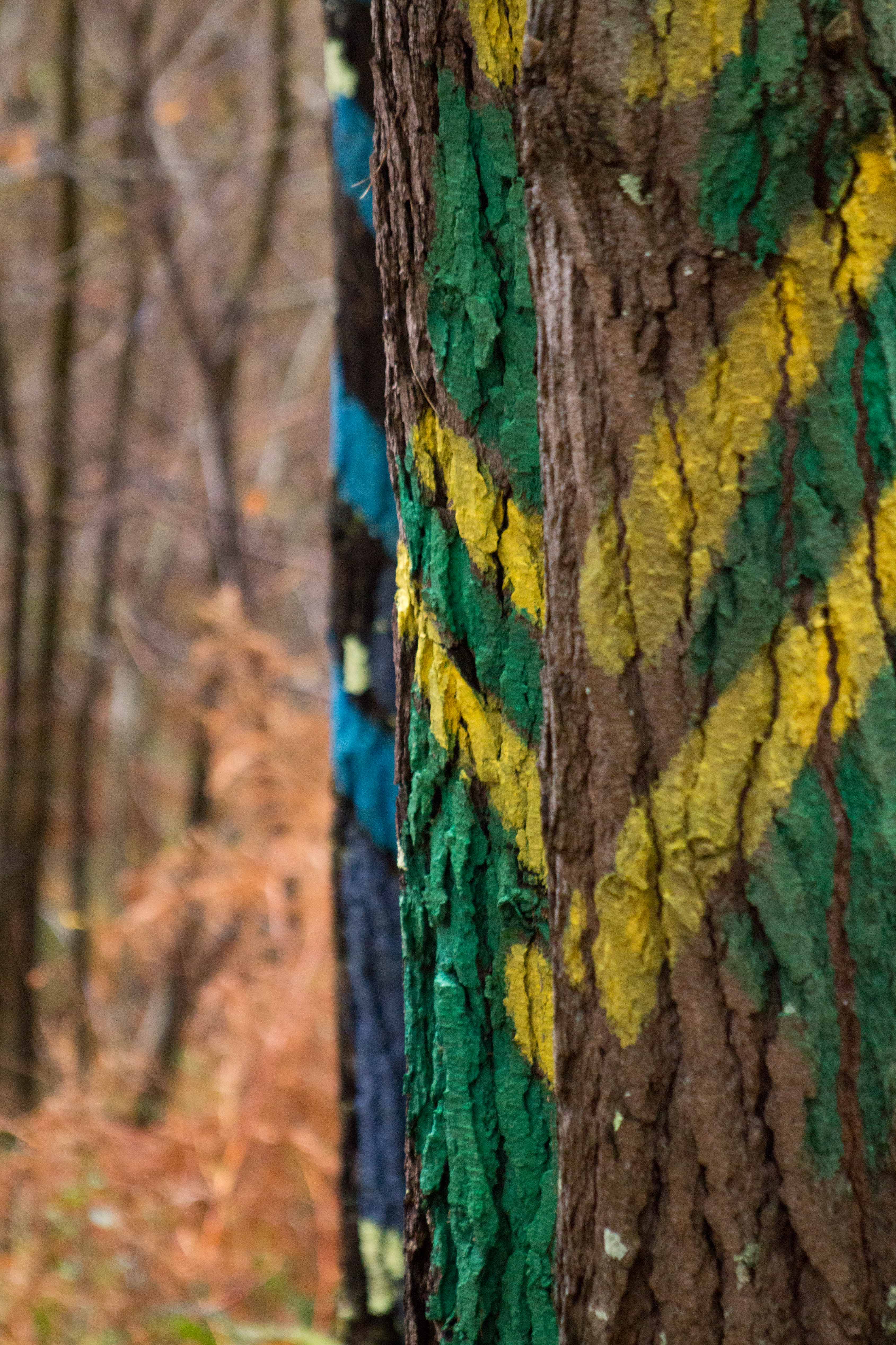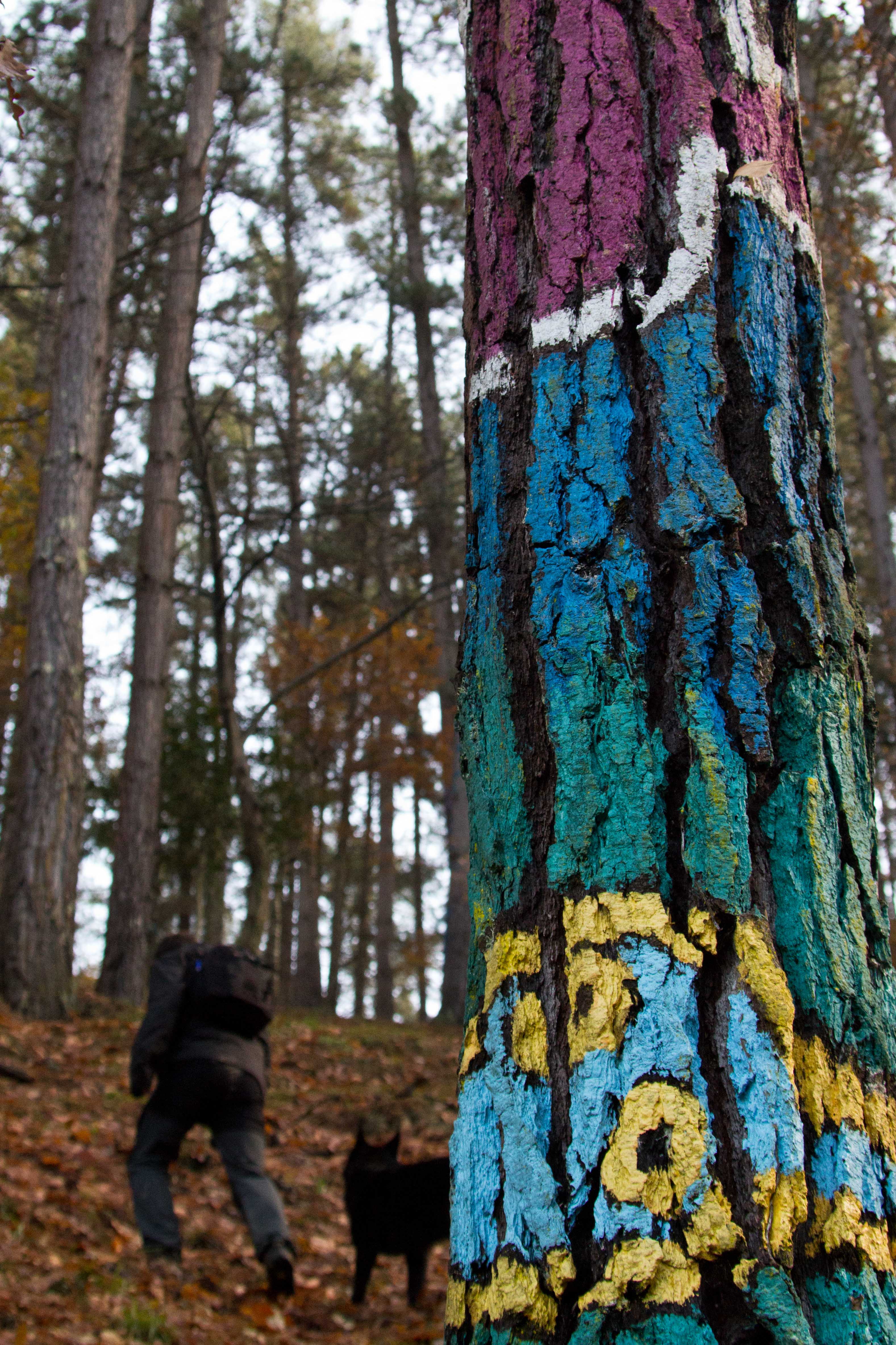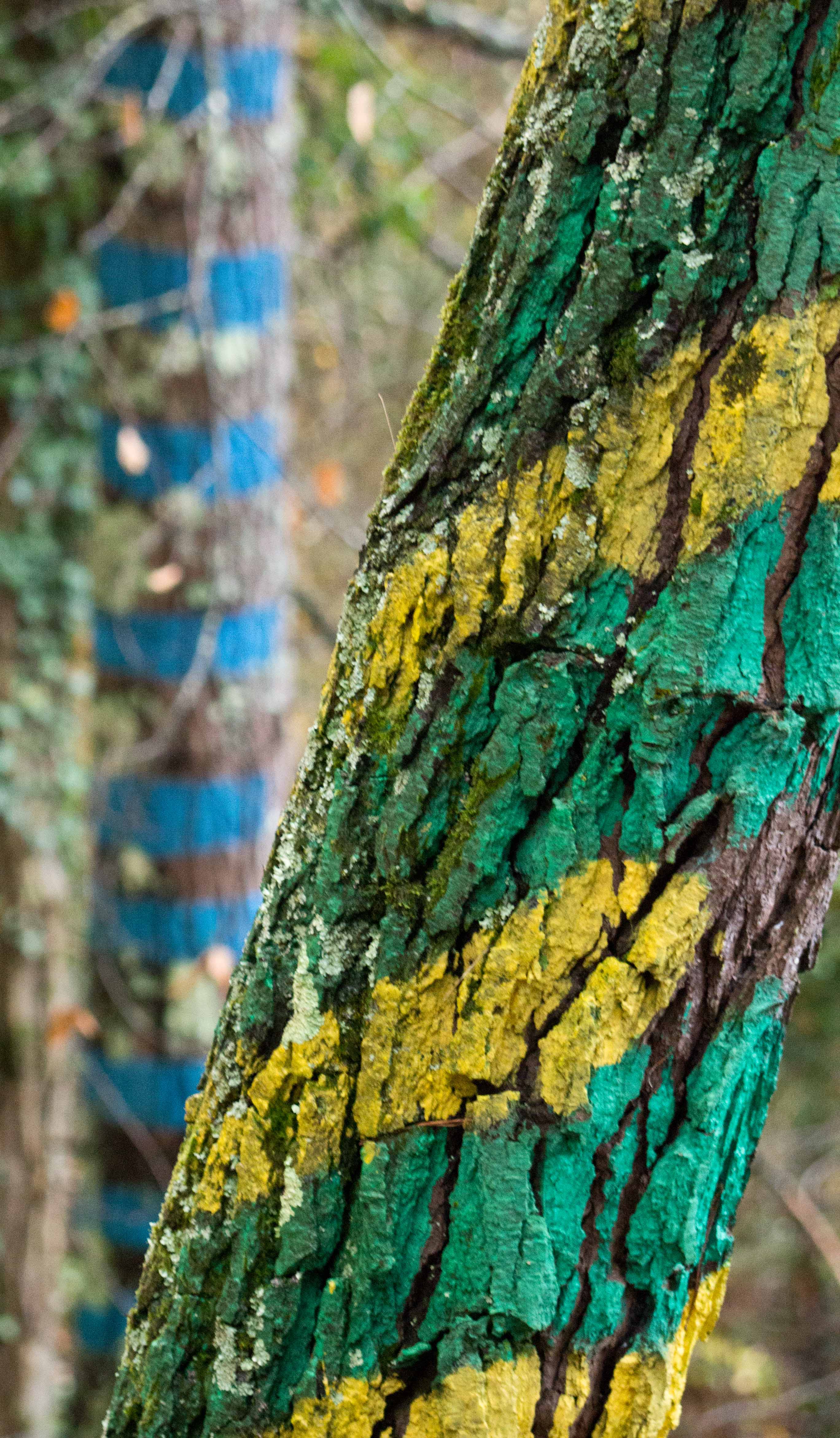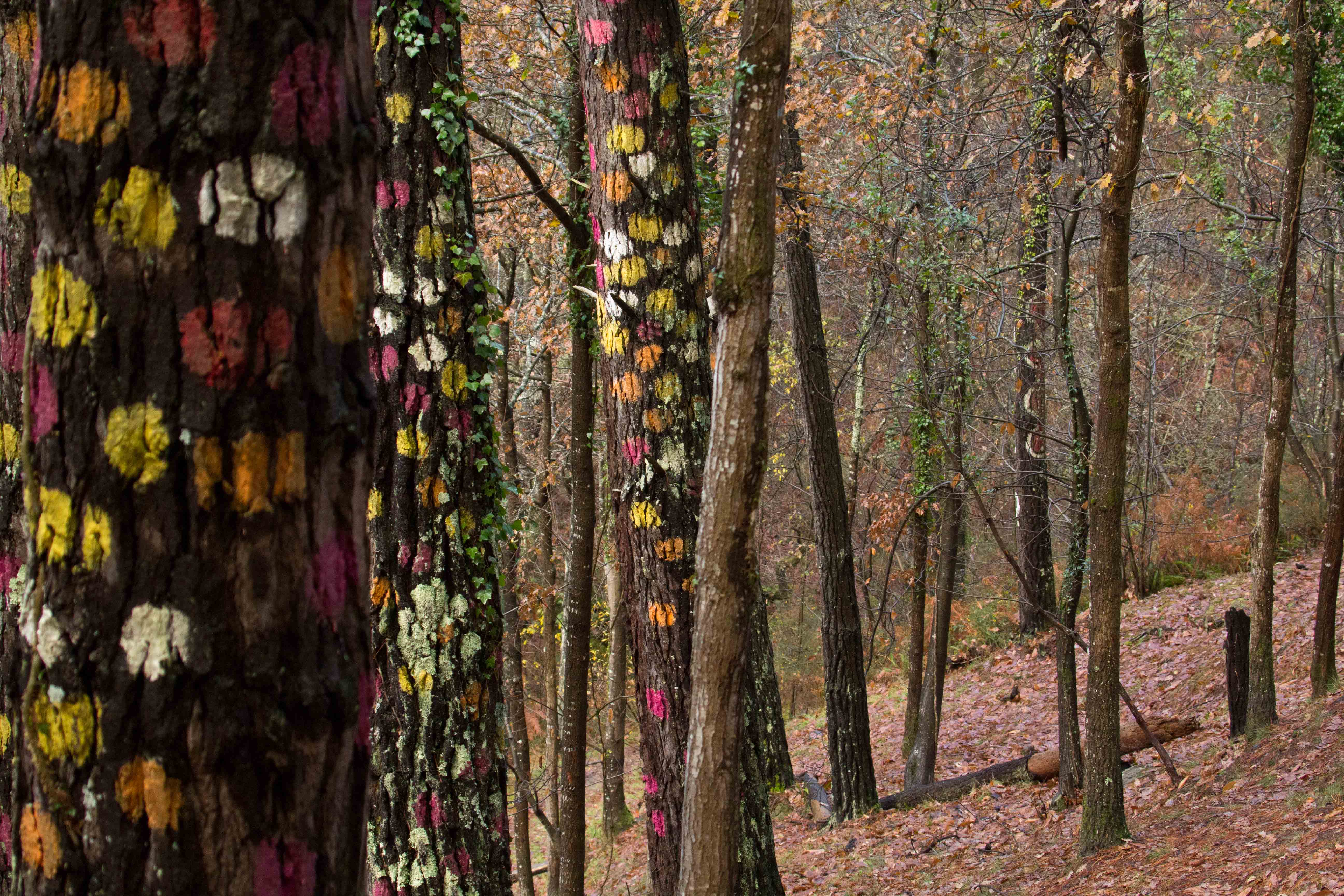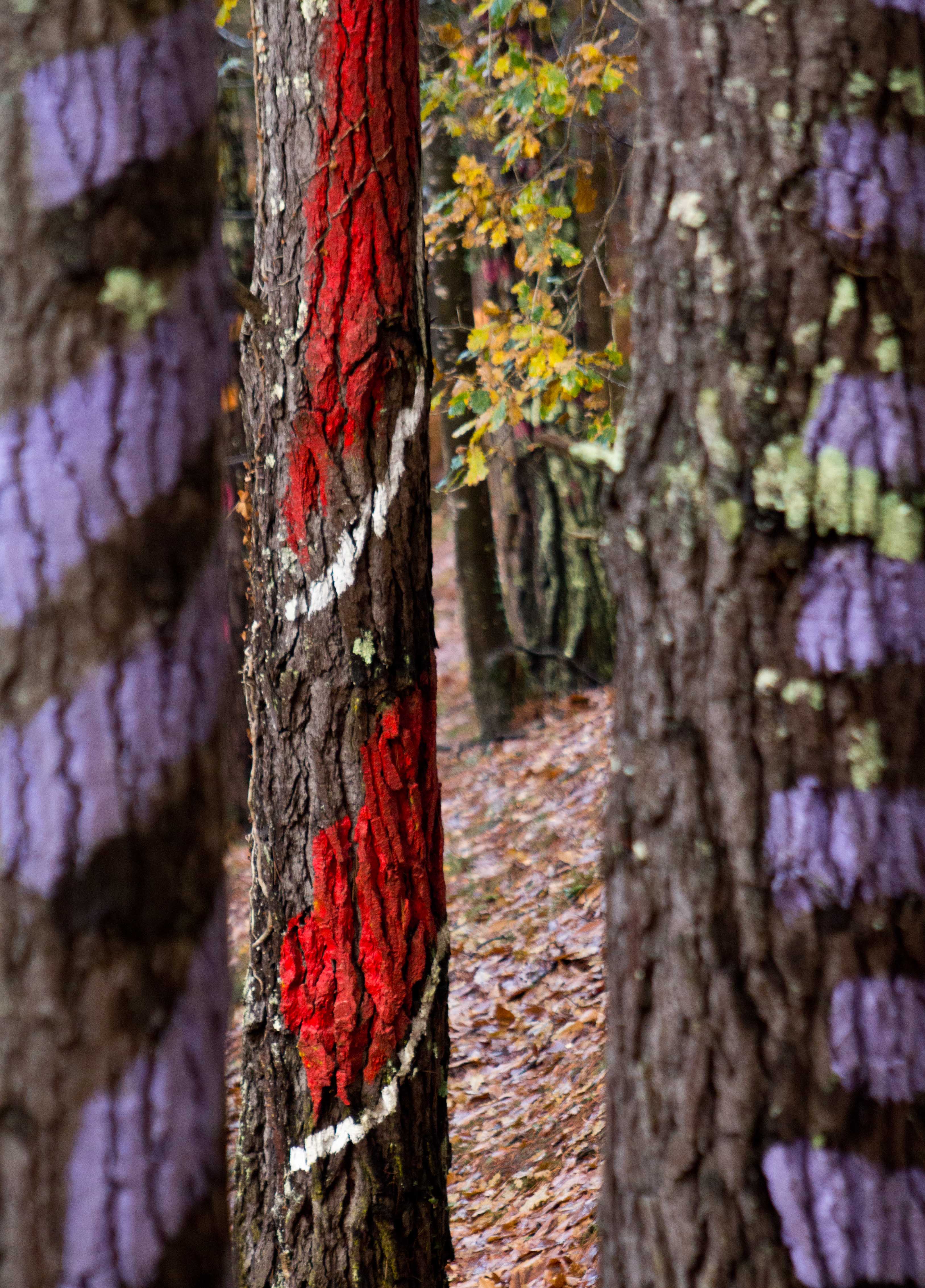 En el bosque de Oma, en Kortezubi (Bizkaia), cada árbol es esclavo de la perspectiva. Con cada paso se construye y se desfiguran los dibujos que viven en los pinos. Son los seres que el artista Agustín Ibarriola pintó en la década de 1980 en la corteza para que nos acompañen y nos vigilen mientras paseamos por sus caminos.