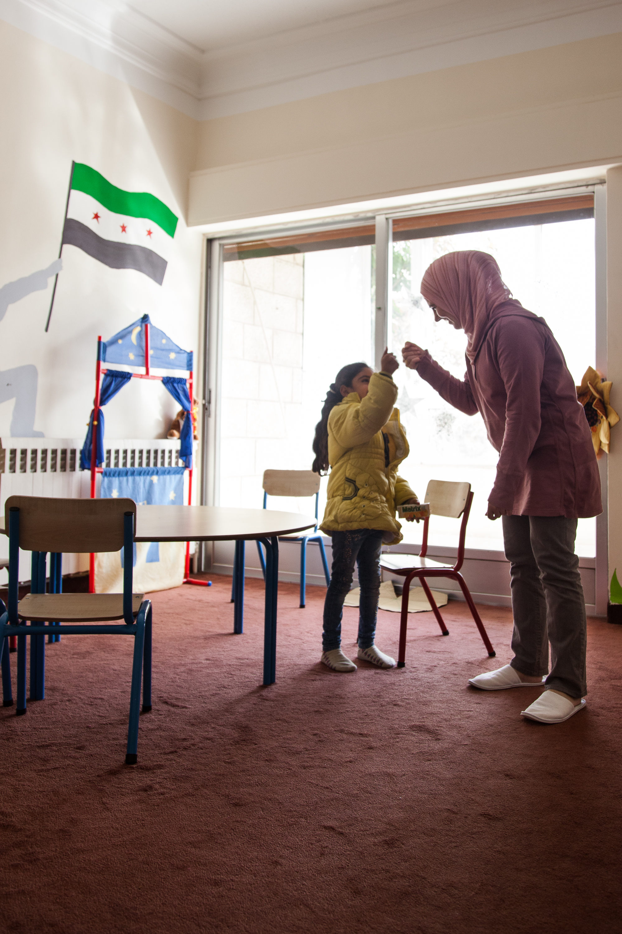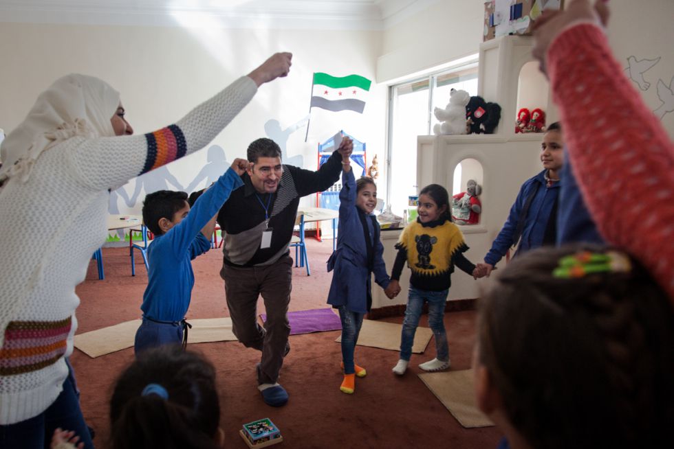 Las paredes de la habitación son lisas y de color crema. El suelo está cubierto de alfombras para que los niños caminen descalzos. En la terraza hay una caja de arena para jugar. Todo el espacio es inofensivo. Solo un dibujo interrumpe la uniformidad cromática. Son las siluetas de antiguos pacientes. En el mural, sus manos están unidas y el último de la fila sujeta una bandera verde, blanca y negra de la revolución siria.