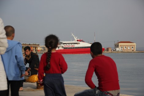 Los primeros deportados de Quíos volvieron a Turquía en ese ferry rojo. Fotografía: Daniel Rivas Pacheco
