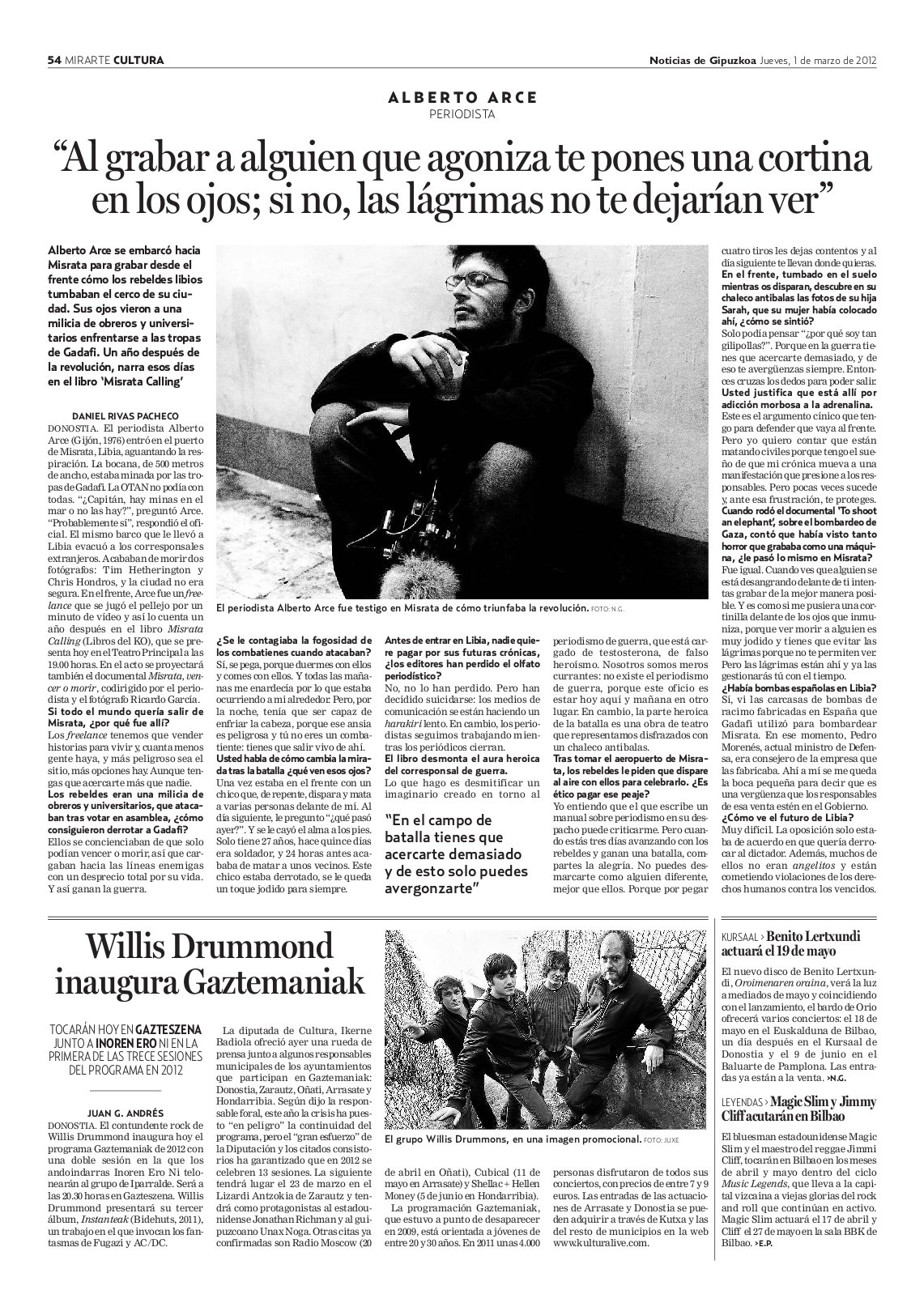 Puedes leerlo entero en Entrevista a Alberto Arce (PDF). Publicado en Noticias de Gipuzkoa el 1 de marzo de 2012. Con el documental Misrata, vencer o morir Alberto Arce y Ricardo García ganaron el premio The Rory Peck Trust en noviembre de 2011 (publico.es).