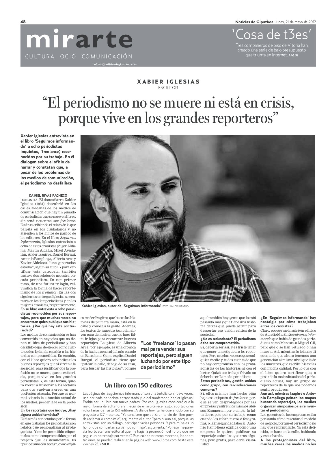 Puedes leerlo entero en Entrevista a Xabier Iglesias: primera y segunda página (PDF). Publicado en Noticias de Gipuzkoa el 21 de mayo de 2012.