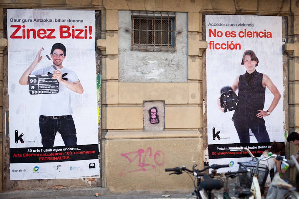 Hay publicidad en el autobús y en el metro. Incluso en la bolsa del pan. Coca-cola quiere que te levantes del asiento y Bankia, que le des cuerda a un engranaje. Kutxabank anuncia que va a rehabilitar un edificio en San Sebastián para realojar a desahuciados. Este último mensaje es mentira. Aunque dos pósteres de tres metros de alto venden esta idea en el edificio Bellas artes de la capital guipuzcoana. El antiguo cine, abandonado desde hace 30 años, se convertirá en un hotel de lujo.